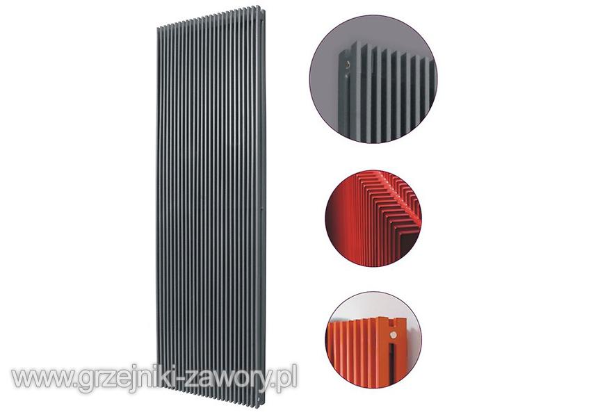 Profile grzewcze są pionowe, ustawione na sztorc i mają wymiar 30 x 10 mm, a kolektory mają przekrój kwadratu i wielkość sięgającą 35 x 35 mm. Kaloryfer zbudowany jest z wyselekcjonowanej stali precyzyjnej. Całość pokryta jest powłoką lakierniczą, która może przybrać dowolną barwę z palety producenta.