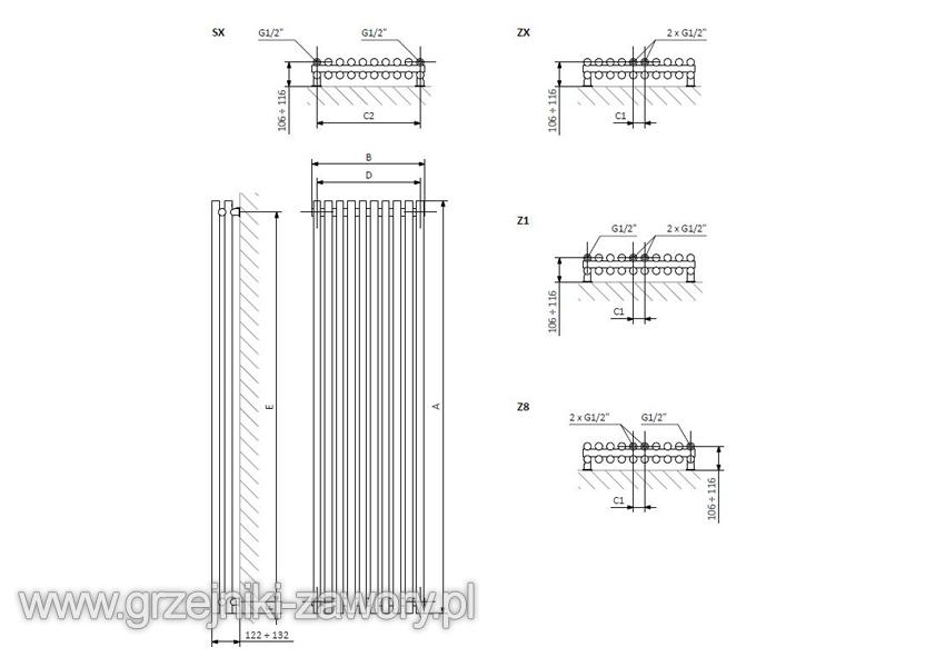 Grzejnik składa się z pionowych profili grzewczych, które są osadzone na poziomych kolektorach. Jest to wersja naścienna. Przy podłączeniu o rozstawie 50mm, polecamy zawór termostatyczny, dzięki któremu można zamontować głowicę.
