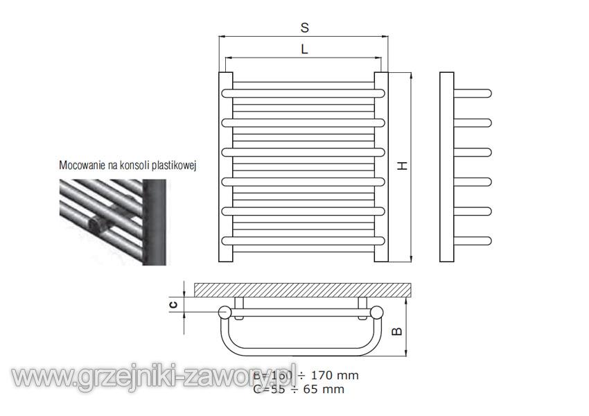 - montaż: grzejnik do montażu naściennego, w zestawie plastikowe konsole mocujące