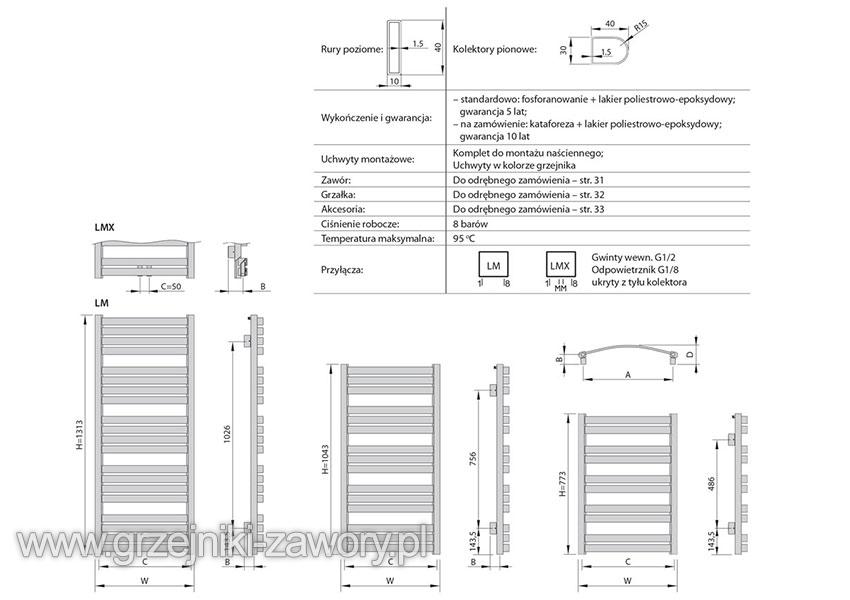 - Lamelo LMX – z przyłączem dolnym środkowym o rozstawie 50 mm + przyłącza w pionowych kolektorach umożliwiające podłączenie grzałki elektrycznej.