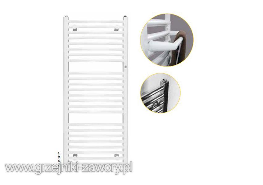 Do tego Omega R może przybrać dowolną barwę z palety producenta. Budowa grzejnika opiera się o kolektory w kształcie literki „D” oraz okrągłe profile grzewcze. Kaloryfer będzie świetnie spisywał się w roli suszarki do mokrych ręczników oraz ubrań. Omega R wyposażona jest trzy możliwości podłączenia, a są to takie przyłącza jak krzyżowe, dolne standardowe oraz dolne środkowe o rozstawie osi 50 mm. Temperatura zasilania grzejnika sięga 95 stopni Celsjusza, natomiast ciśnienie robocze nie powinno przekraczać 1,0 MPa.