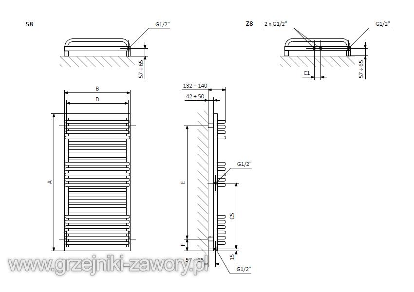 Model dostępny jest w wielu wariantach podłączeń hydraulicznych, z których najpopularniejsze to: dolne standardowe, dolne środkowe o rozstawie 50 mm z możliwością podłączenia grzałki elektrycznej po prawej stronie, boczne lewe o rozstawie 500 mm z miejscem na podłączenie grzałki elektrycznej po prawej stronie od dołu, boczne prawe o rozstawie 500 mm z miejscem na podłączenie grzałki elektrycznej po lewej stronie od dołu.