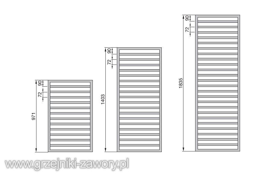 - dolne o rozstawie 50 mm w środkowej części grzejnika