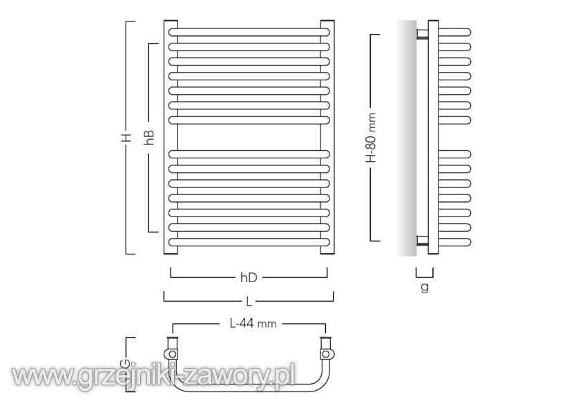 Zbudowana jest w orientacji pionowej i składa się z okrągłych profili grzewczych o średnicy 22 mm każdy. Łączą one ze sobą kolektory, które kształtem przypominają literkę „D” i mają wielkość 40 x 30 mm. Pomiędzy rzędami profili grzewczych znajdują się przerwy, które służą za miejsce do odwieszania mokrych tekstyliów. Powierzchnia pokryta jest powłoką lakierniczą.