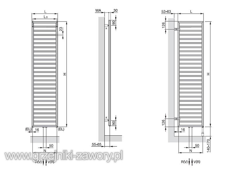 - montaż: grzejnik do montażu naściennego, w zestawie konsole mocujące (zestaw montażowy w kolorze grzejnika)