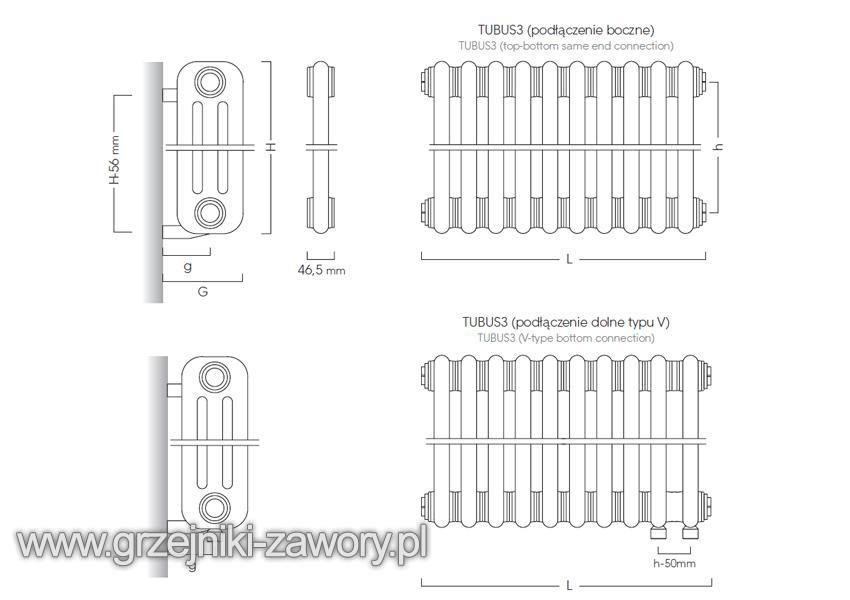 - podłączenie typu V - rozstaw przyłączy 50 mm z wbudowaną wkładką zaworową - na dole w bocznej części grzejnika po lewej lub po prawej stronie - grzejnik jest obracalny,