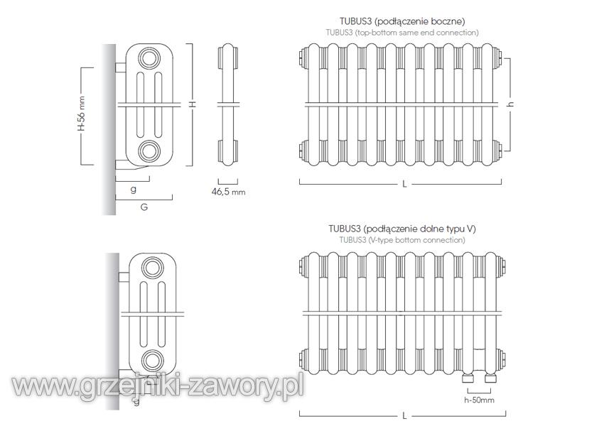 - podłączenie typu V - rozstaw przyłączy 50 mm z wbudowaną wkładką zaworową - na dole w bocznej części grzejnika po lewej lub po prawej stronie - grzejnik jest obracalny,