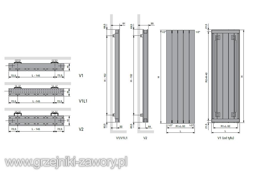 Grzejnik pionowy Viola V1 to, według producenta, klasyka grzejników dekoracyjnych, a nawet – pierwowzór dla innych marek takich grzejników. Smukłe, wysokie, pionowo ułożone profile grzewcze modelu naściennego mają formę szerokich paneli, ściśle do siebie przylegających – tworzących gładką, płaską powierzchnię nieco przypominającą powierzchnię grzejników płytowych. Model V1 to wersja podstawowa, wyposażona w jeden rząd profili grzewczych o wymiarach przekroju 70 mm x 10 mm, opartych na kolektorach 34 mm x 34 mm.