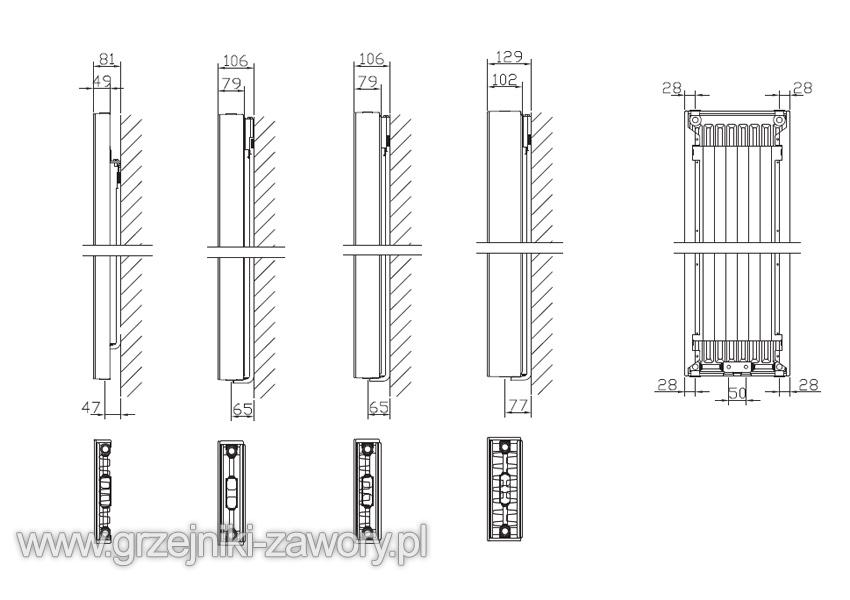 - dolne standardowe (o rozstawie zależnym od szerokości grzejnika),
