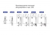 Wyposażony jest w komplet zamocowań (konsole typu L, dla wysokości 200 mm typu Monclac), posiada wbudowany zintegrowany zespół zaworowy - wkładkę zaworową Heimeier 4360 lub 4361 (wersja bez głowicy termostatycznej), wmontowane zaślepki i odpowietrznik.