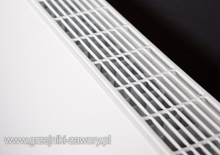 Wyposażony jest w komplet zamocowań (konsole typu L, dla wysokości 200 mm typu Monclac), posiada wbudowany zintegrowany zespół zaworowy - wkładkę zaworową Heimeier 4360 lub 4361 (wersja bez głowicy termostatycznej), wmontowane zaślepki i odpowietrznik.