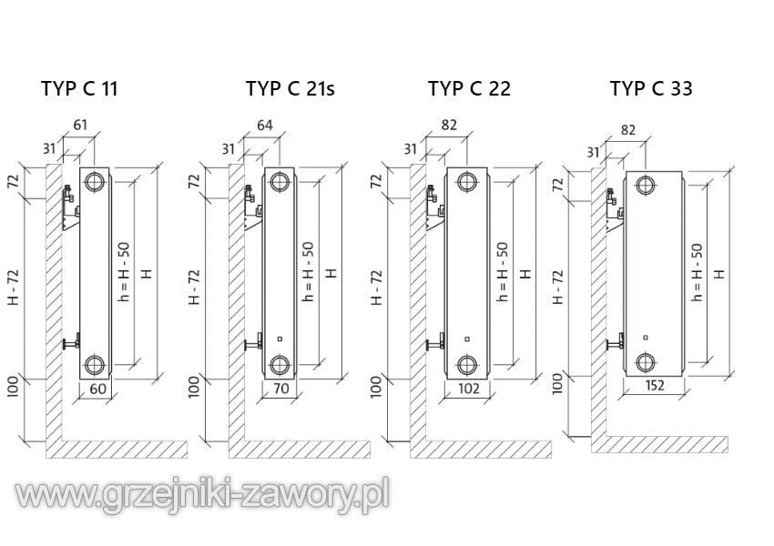 Purmo Compact można zamówić w czterech głębokościach – 60 mm (C11), 70 mm (C21s), 102 mm (C22) oraz 152 mm (C33). Ma to znaczący wpływ na moc grzejnika i jego ostateczny wygląd. Warto pamiętać, że modele te najlepiej czują się na ścianach zewnętrznych, zamontowane pod oknem.