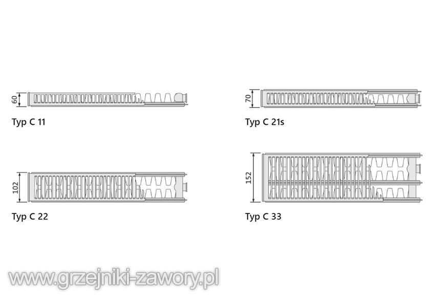 Purmo Compact można zamówić w czterech głębokościach – 60 mm (C11), 70 mm (C21s), 102 mm (C22) oraz 152 mm (C33). Ma to znaczący wpływ na moc grzejnika i jego ostateczny wygląd. Warto pamiętać, że modele te najlepiej czują się na ścianach zewnętrznych, zamontowane pod oknem.