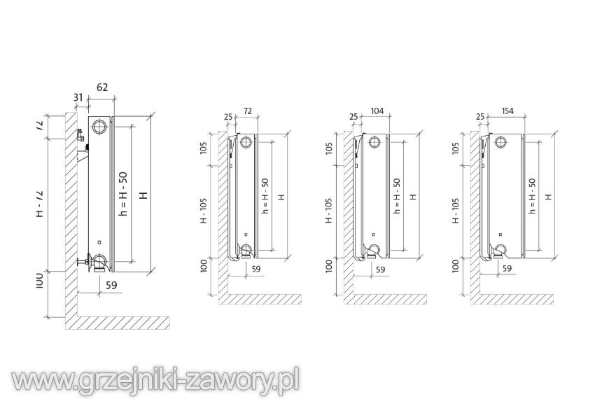 - komplet składa się z grzejnika, odpowietrznika, korków zaślepiających, mocowań ściennych oraz wkładki zaworowej z gwintem M30x1,5;