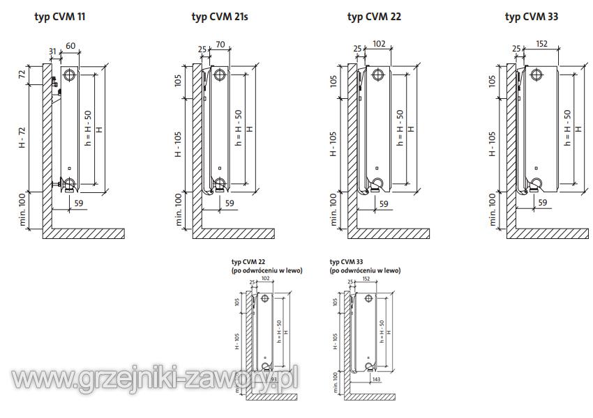 - grzejnik dostępny jest w czterech wersjach głębokości, mianowicie w typie 11 (60 mm), typie 21s (70 mm), typie 22 (102 mm) oraz typie 33 (152 mm);