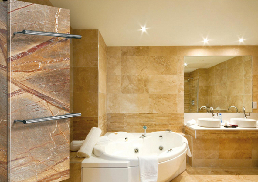 Grzejnik kamienny Stone to propozycja ze stajni Radeco. Płaski front z poręczami znajdującymi się na właśnie na przodzie świetnie sprawdzi się w łazience, gdzie będzie pełnił rolę zarówno dekoracji jak i po prostu suszarki do mokrych ręczników. Wieszaki są chromowane, co świetnie komponuje się z różnymi wzorami kamienia, oferowanymi przez producenta.